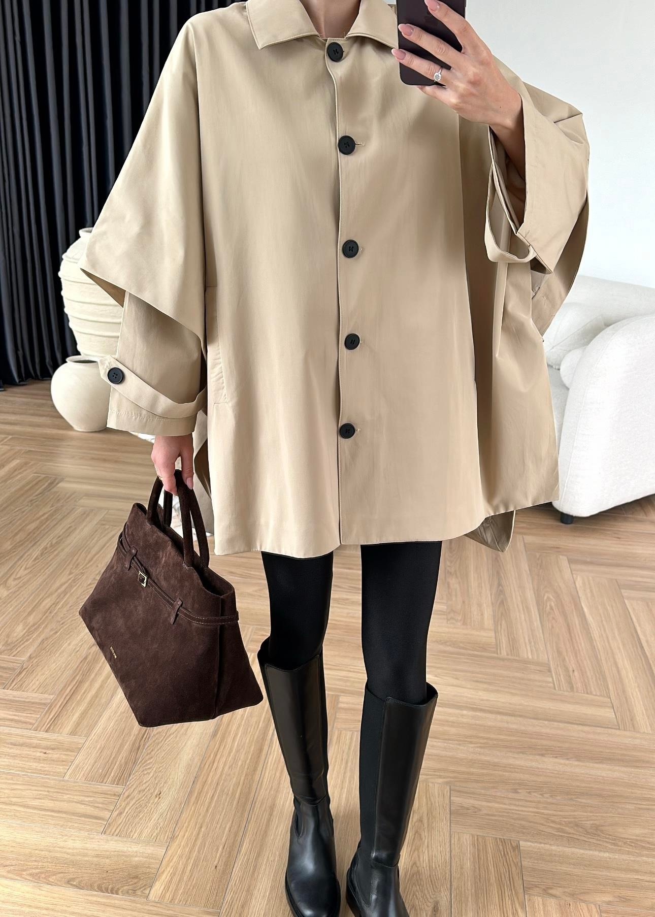 Uzun Kollu Pelerin Trençkot BEJ