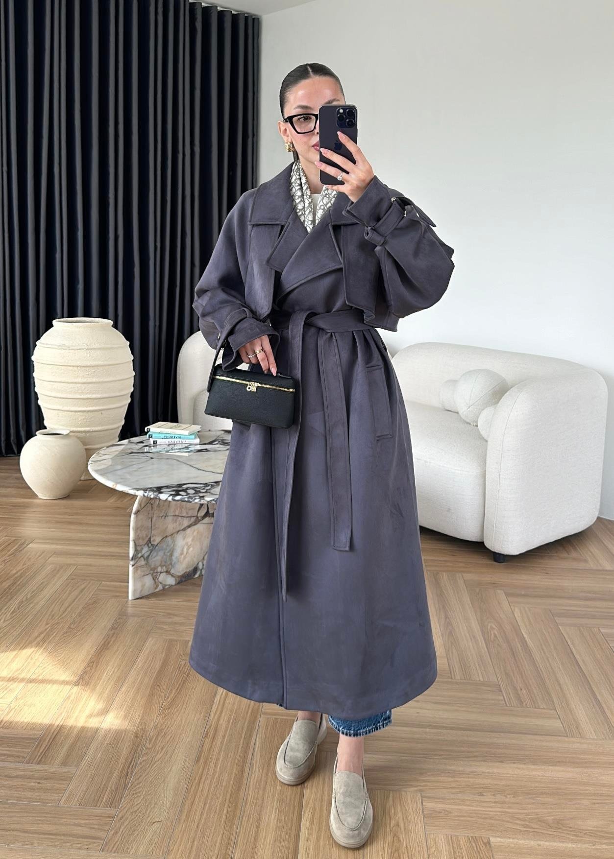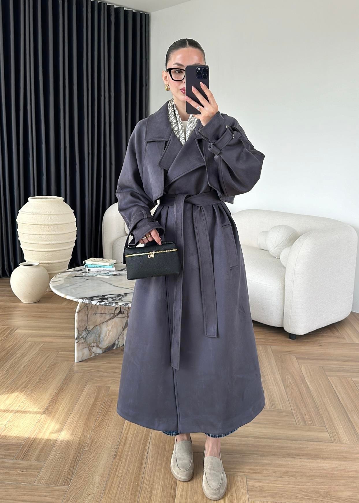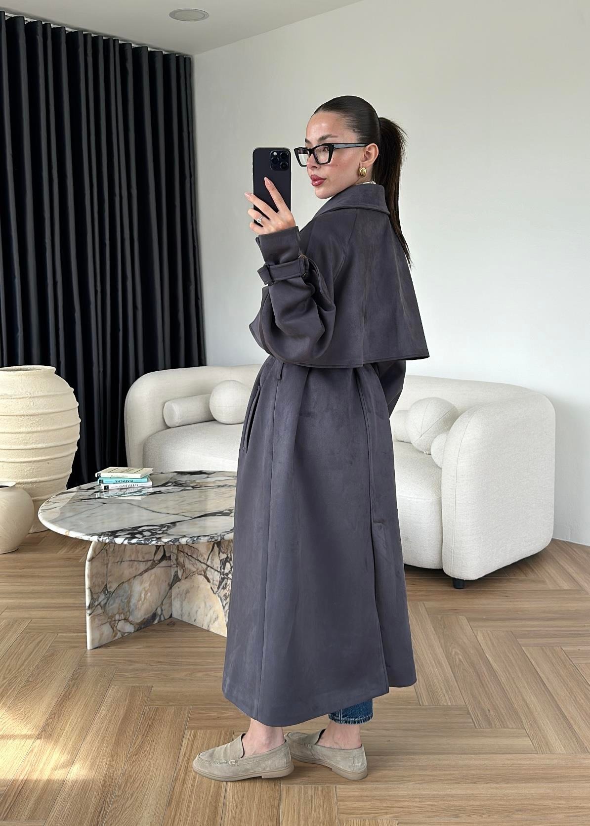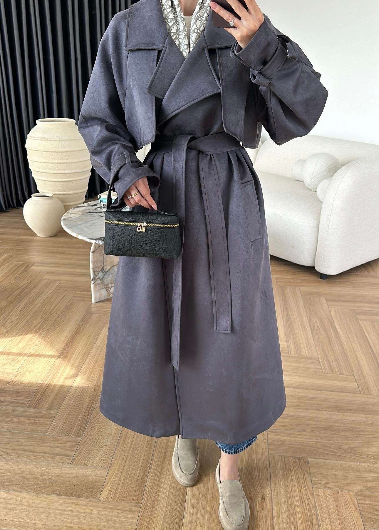 Apoletli Süet Trençkot ANTRASİT MAVİ