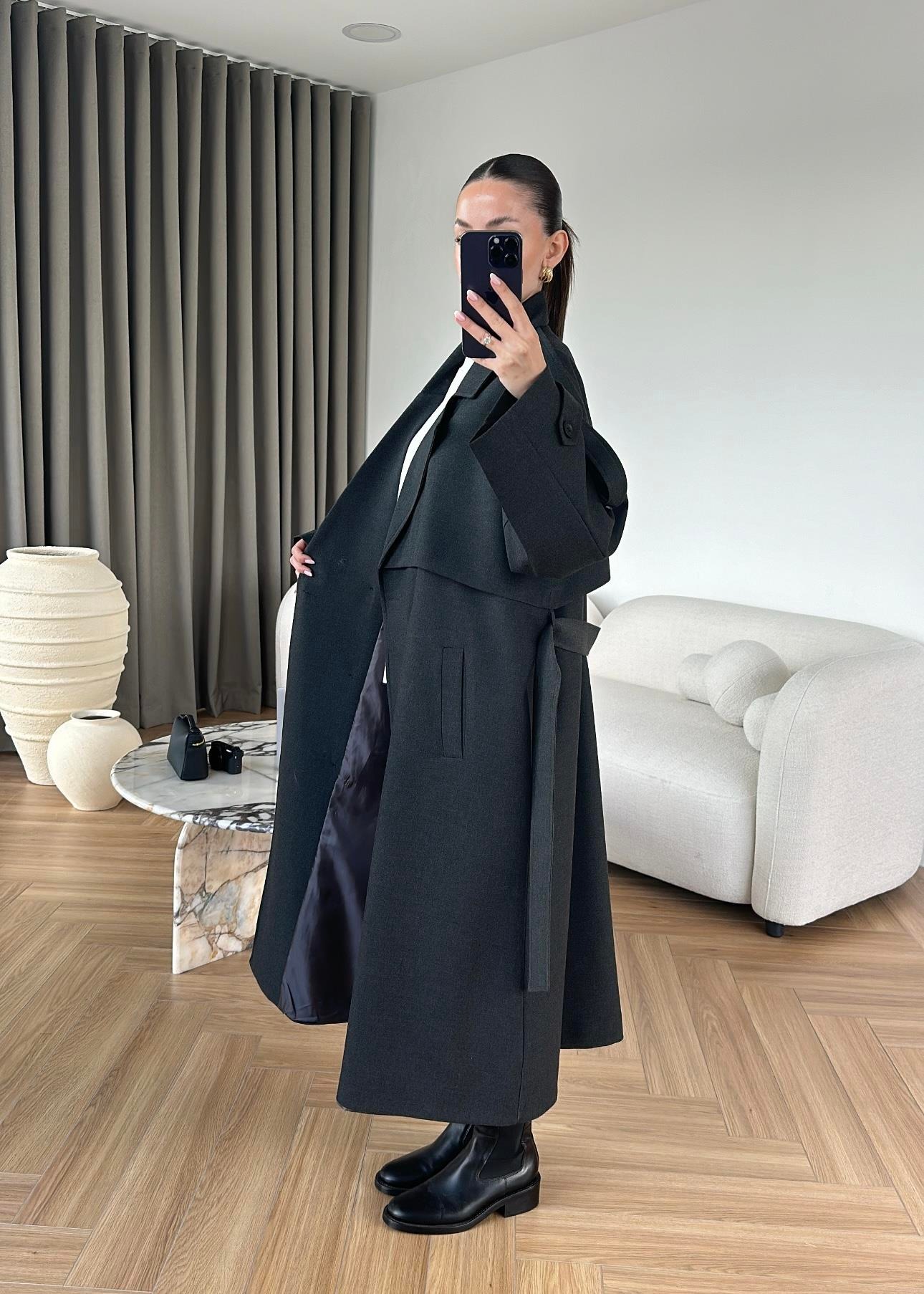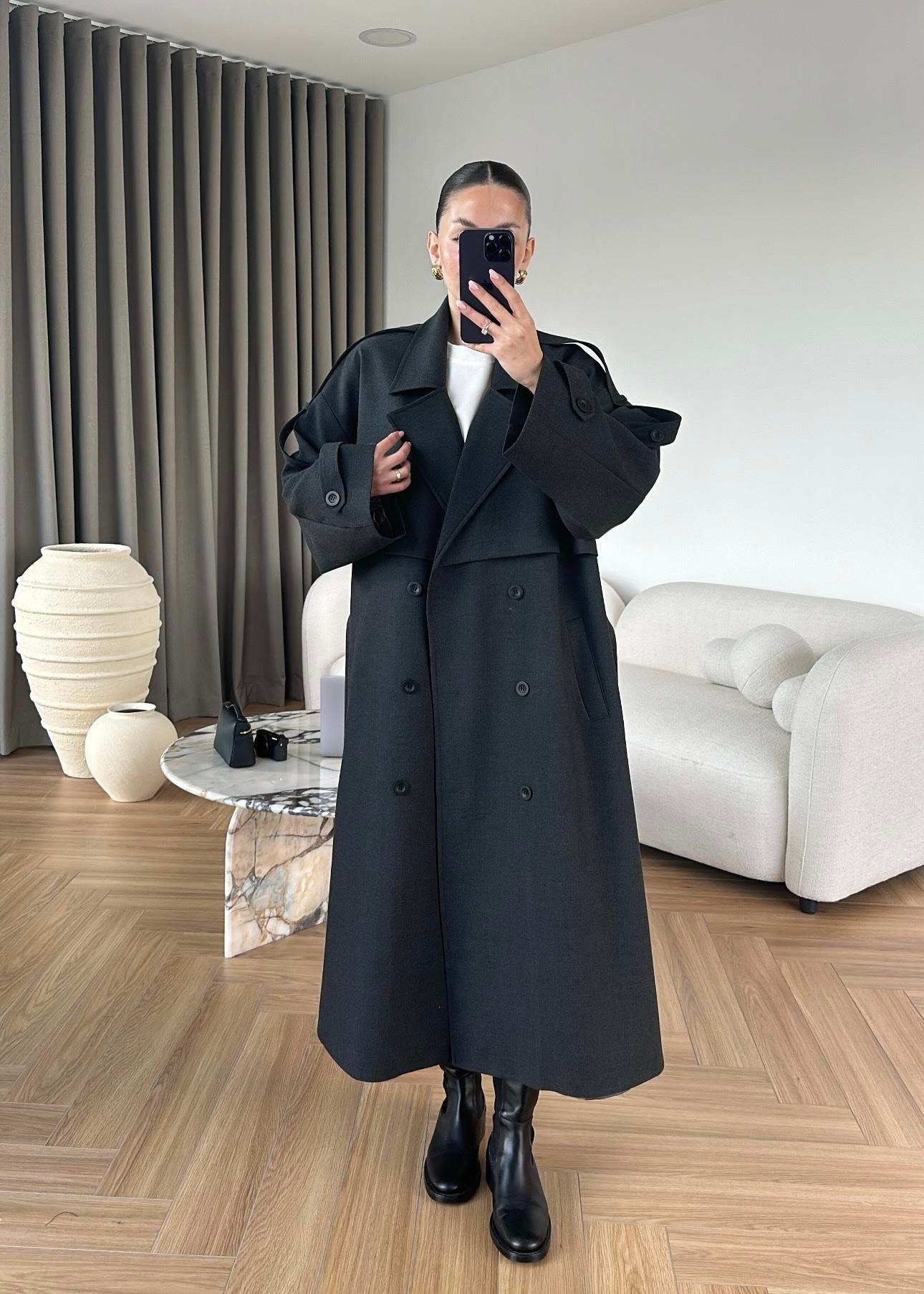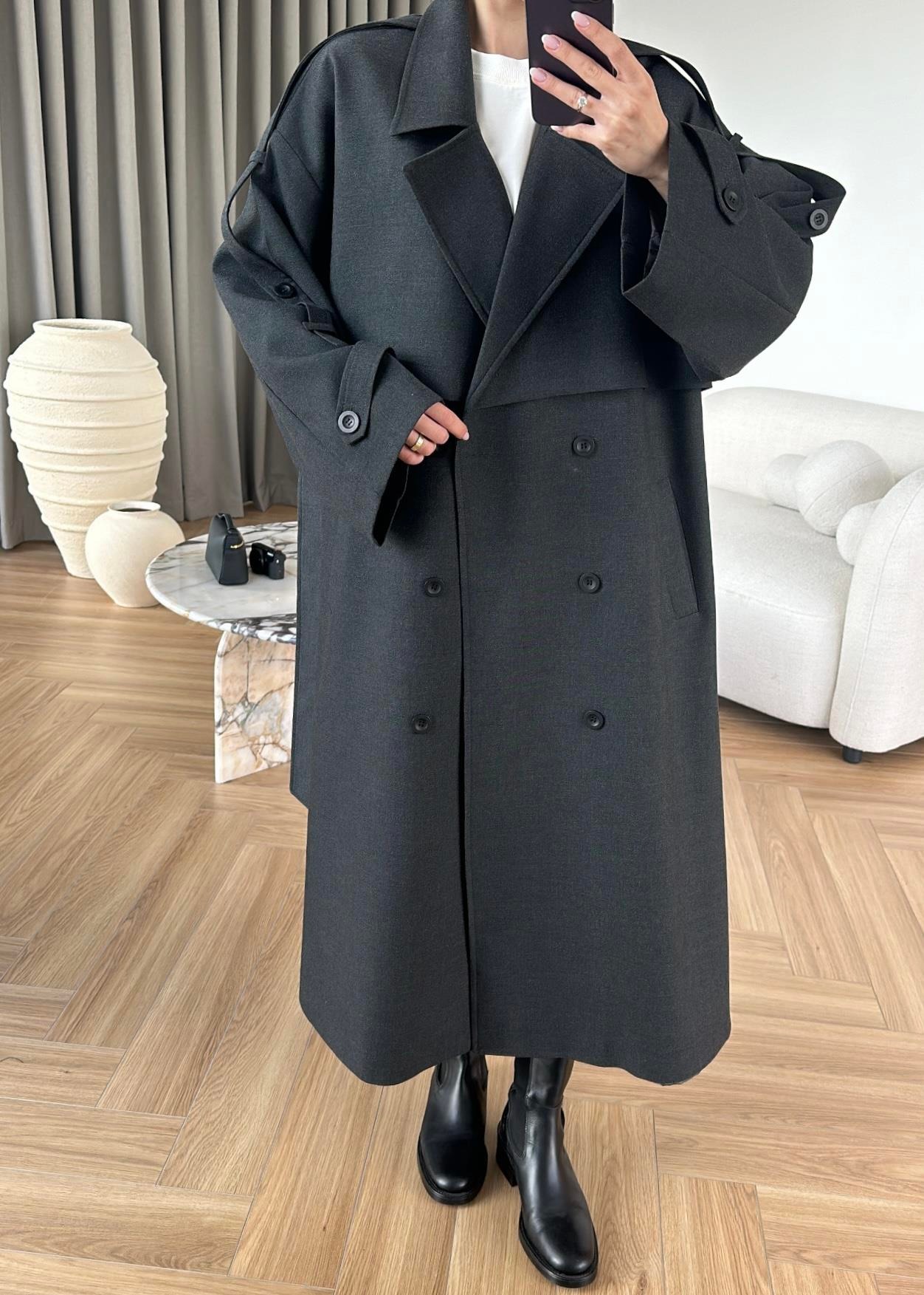 Omuzu Uzun Apoletli Trençkot FÜME
