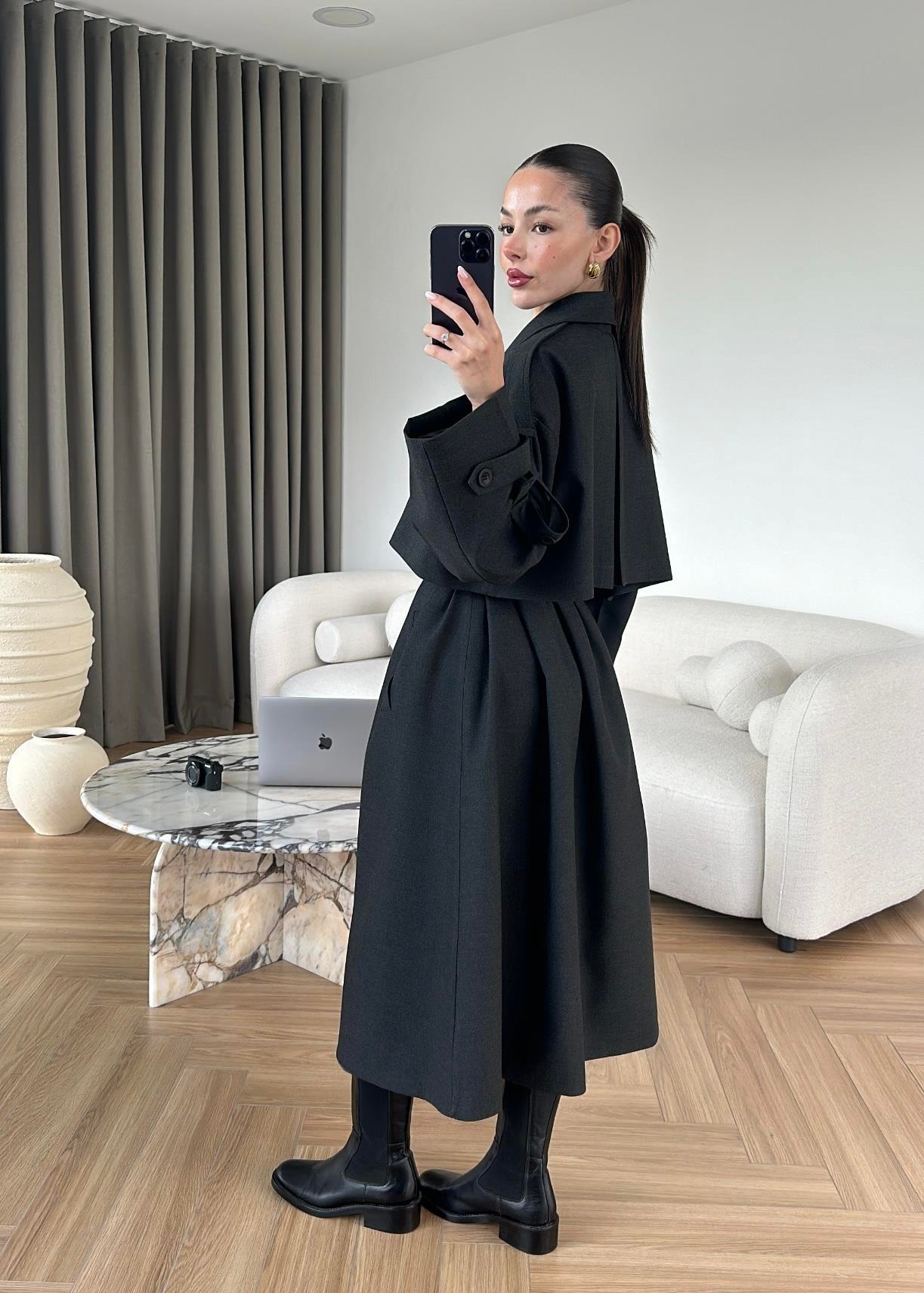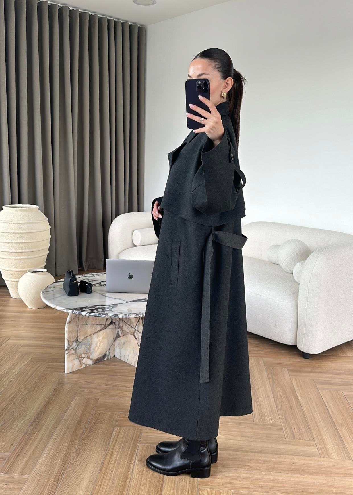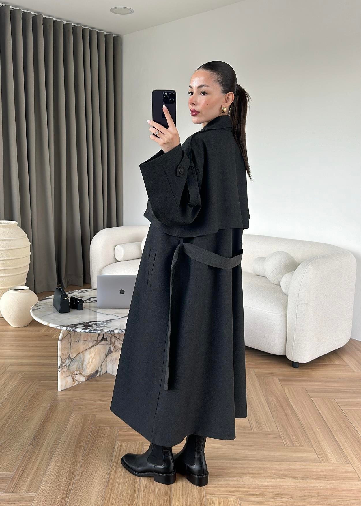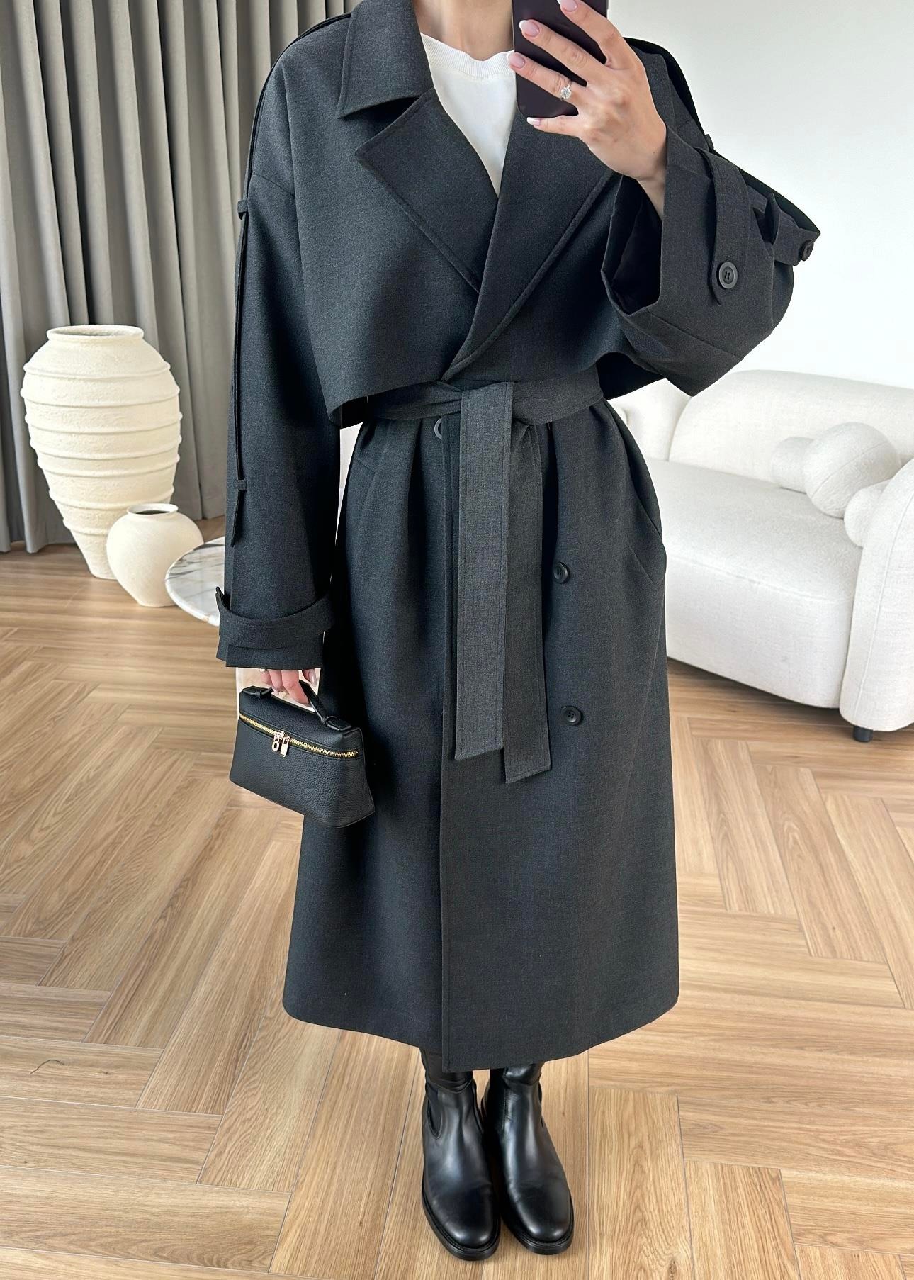 Omuzu Uzun Apoletli Trençkot FÜME