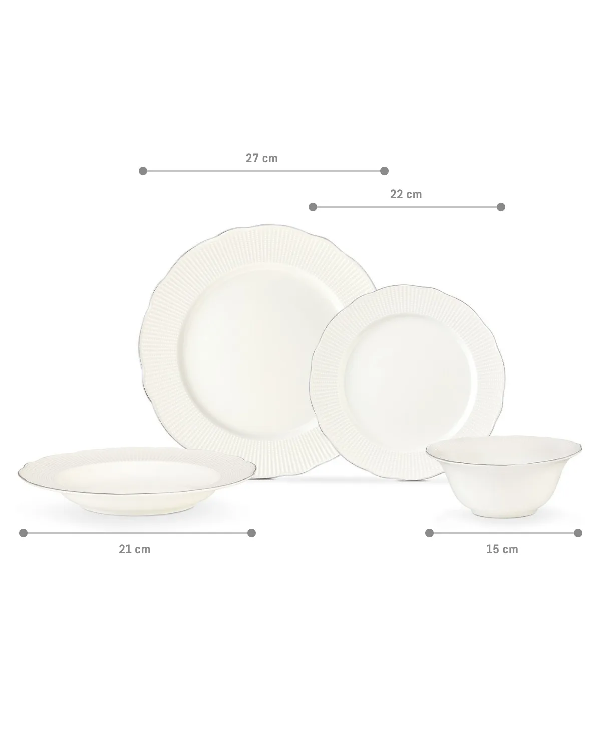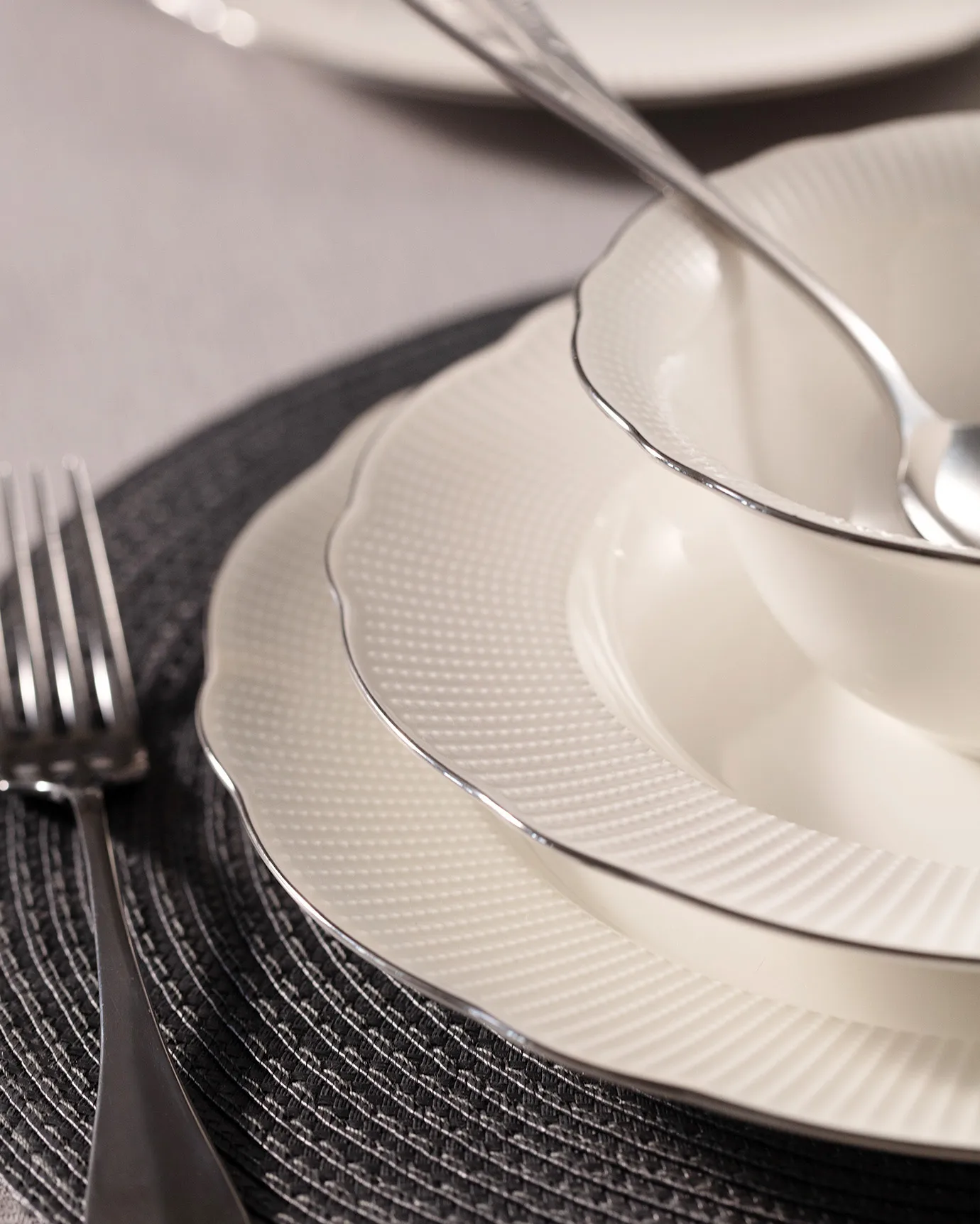 Yemeklerinizi ve özel davetlerinizi daha da özel kılacak bu yemek takımı, zarafetiyle göz kamaştırırken dayanıklı yapısıyla da güven verir. Sofranızı şık bir görünüme kavuşturan bu takım, her öğünde keyifli bir yeme deneyimi sunar.