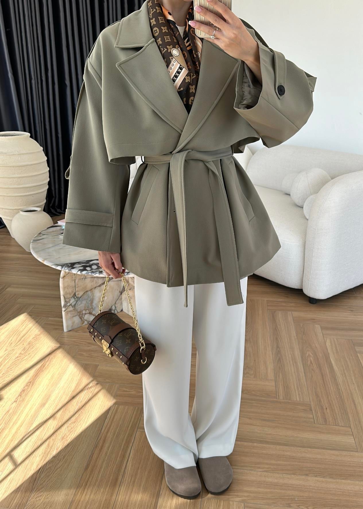 Çekimde S Beden kullanılmıştır,Astarlı kuşaklı ve ceplidir.